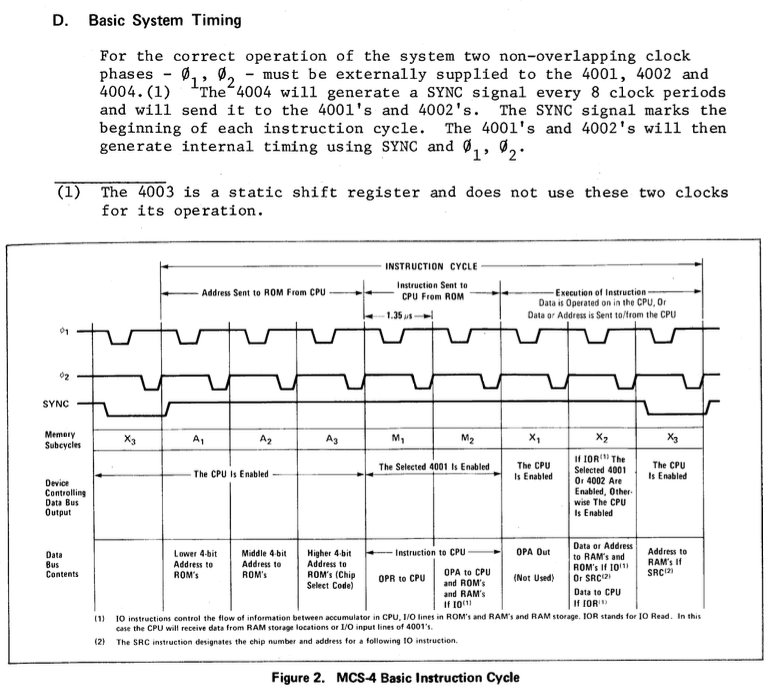 Note that the MCS-4 is super into active low pins, so you need to mentally flip this timing diagram. Its basically saying that CLK1 and CLK2 alternate, and then after 7 cycles of that you get a single cycle of CLK1, CLK2, and SYNC. This is done because addresses and data are multiplexed across only four pins on the chops to keep pin counts down. SYNC is generated internally in the 4004 based off of CLK1 and CLK2.