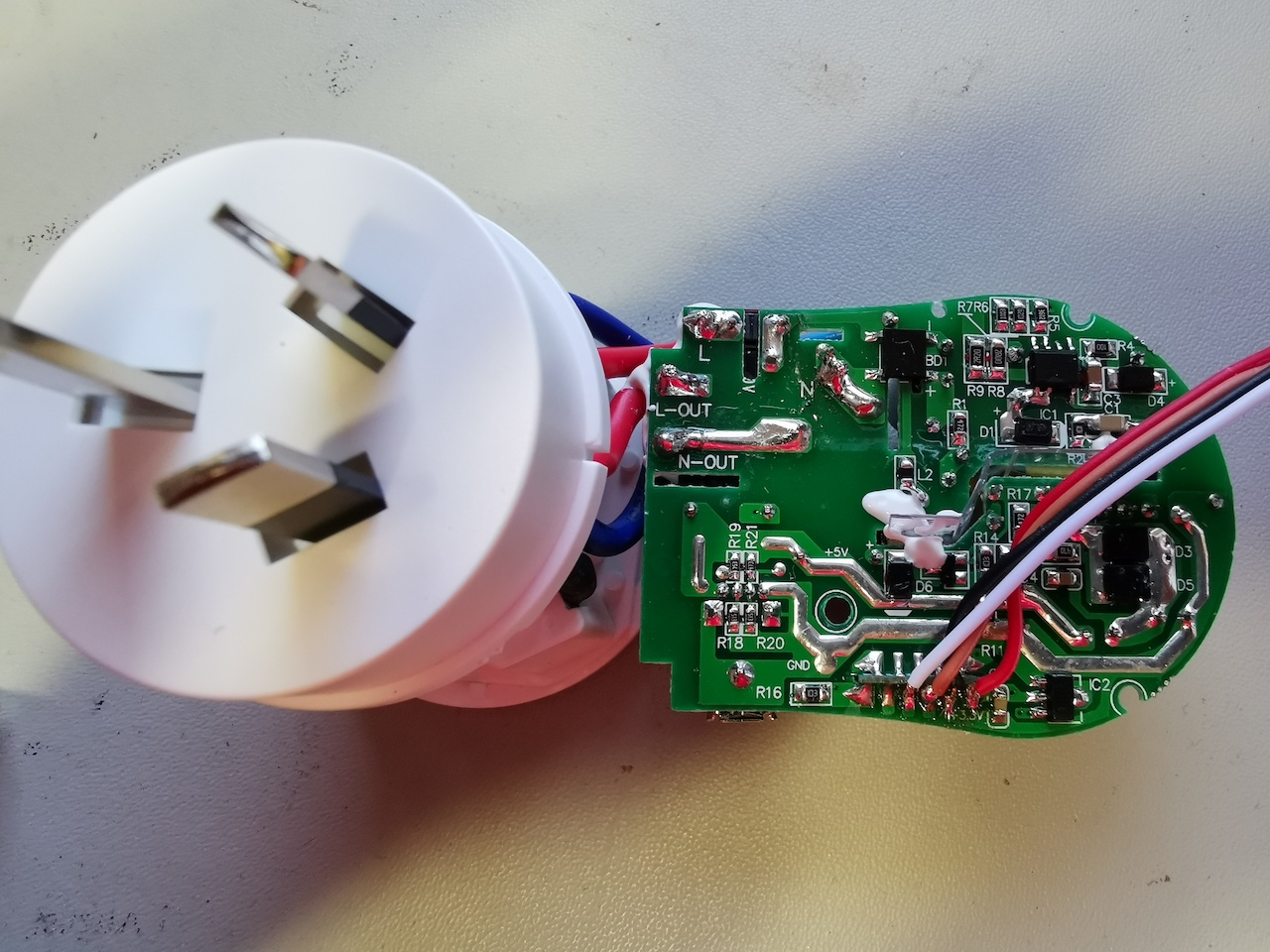 That would be much more annoying on the globes, but it turns out these smart plugs are really easy to open and that Tuya has documented the pin out of the controlling microprocessor. So, I ended up temporarily soldering some cables to the microprocessor to debug what had gone wrong. It should be noted that as a soldering person I make a great software engineer: