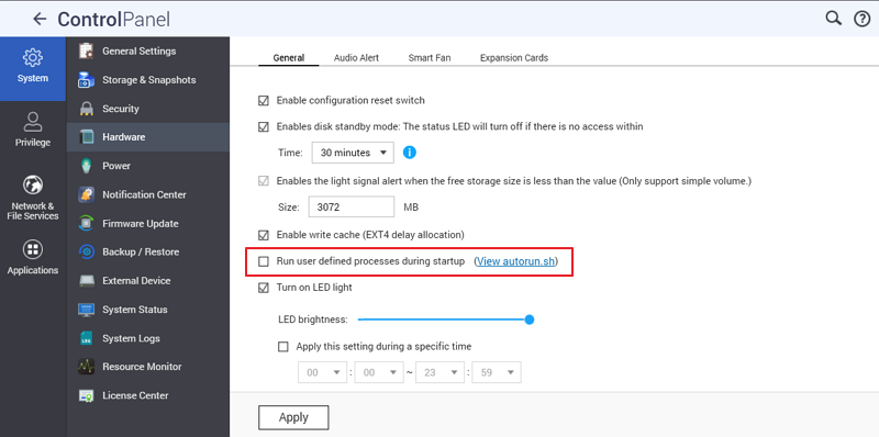 Finally, we also need to turn on support for the autorun.sh script in the QNAP control panel: