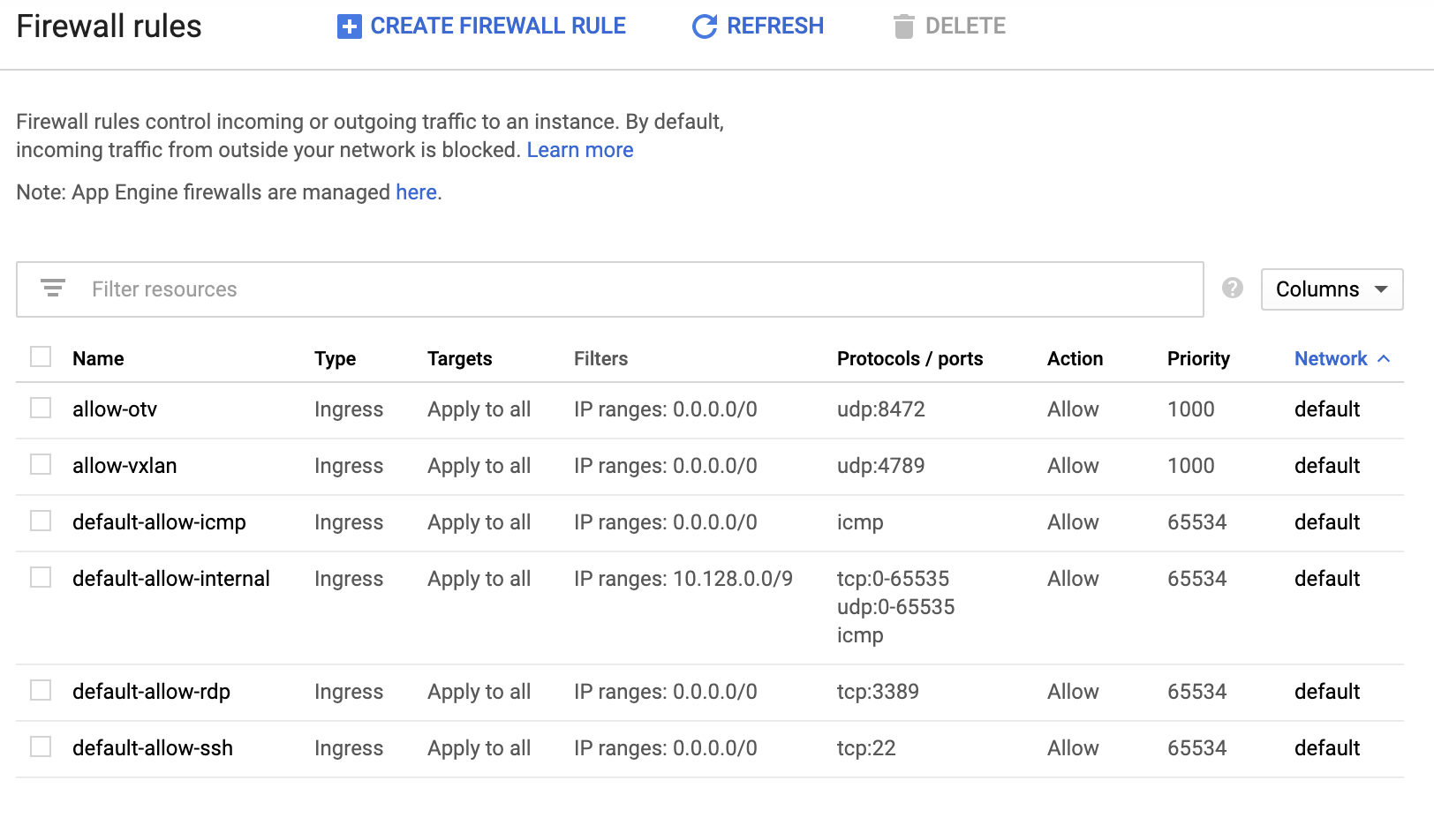 I am pretty sure that this style of mesh (all nodes connected) wouldn’t scale past non-trivial sizes, but hey baby steps right? Finally, because we’re using Google Cloud we need to add firewall rules to allow our traffic into the instances: